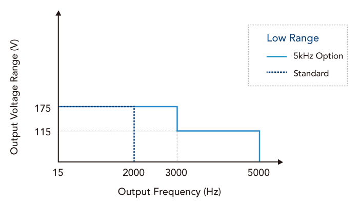 Chroma 61509/61508/61507机种可藉由选购配件提供5kHz高频率输出功能。而搭载此选购配件后,交流源机台会有不同的High / Low档位输出电压范围,其细节如下图所示。
