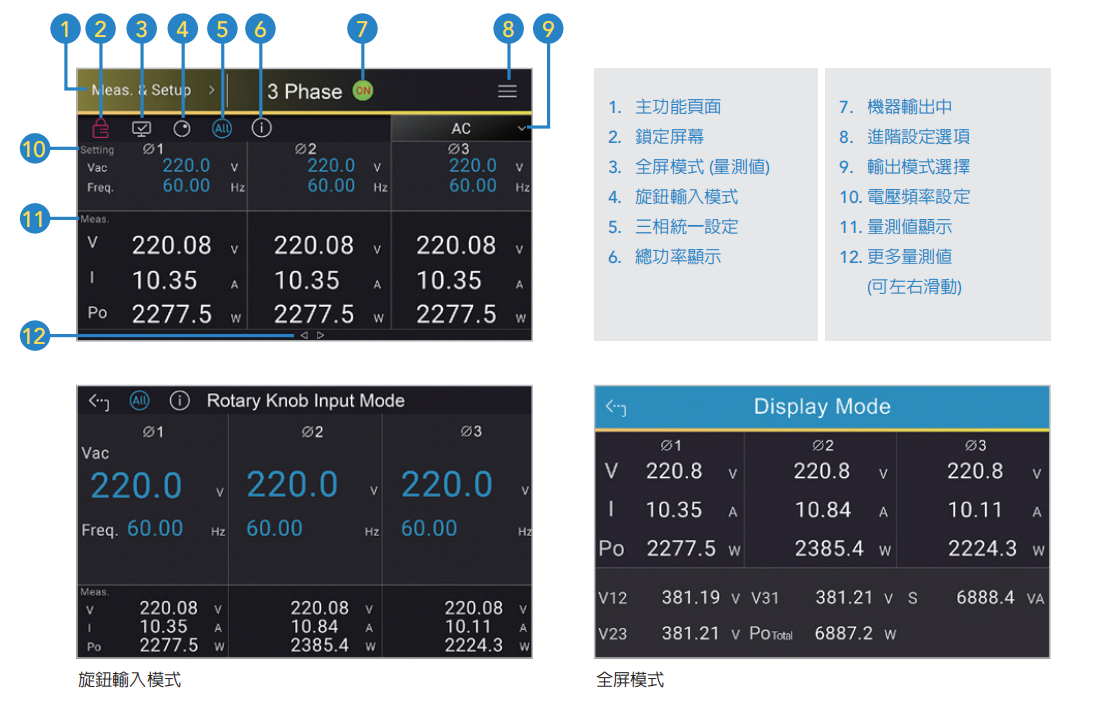 Chroma 61809/61812/61815机种配备触控式操作屏幕,提供直观的UI界面让使用者快速进行多项设定和操作。其中的旋钮输入模式可针对欲设定的参数做放大显示,适用于需要微调参数的测试应用;全屏模式则可将所有测量值扩展至全屏,适用于完成输入设定后的观察环节,提供使用者更清楚的测量参数画面。