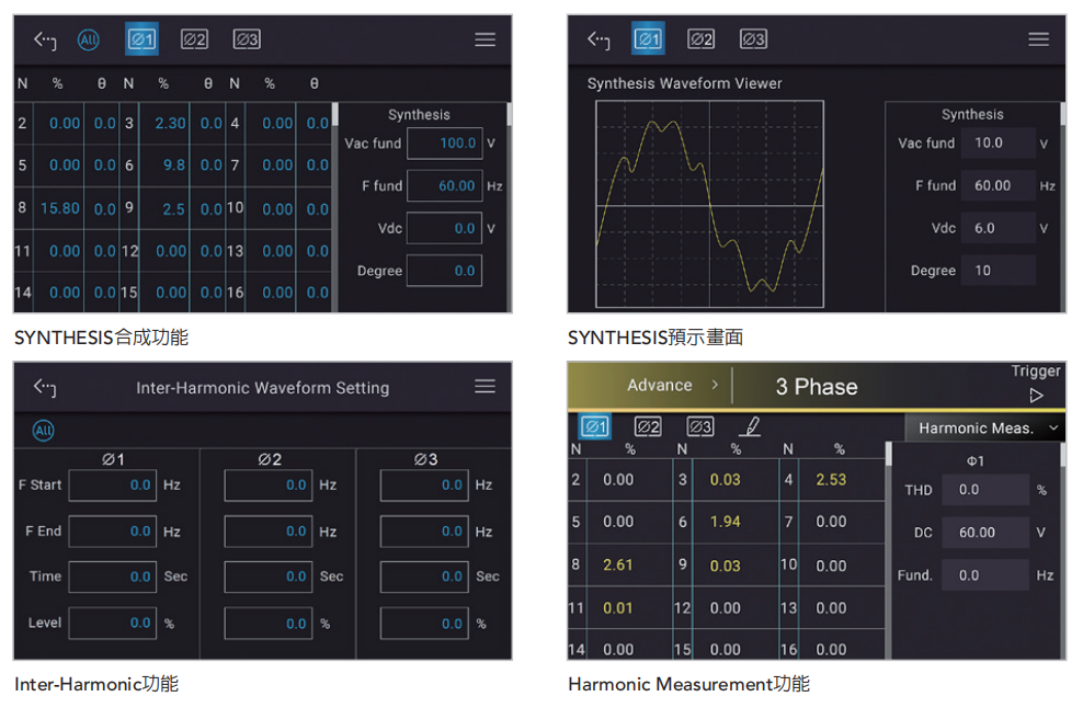 SYNTHESIS(合成)功能提供以50Hz或60Hz为基本频率来设定50阶的谐波成份,形成周期性的失真波形;Inter-Harmonic功能可在基频之外,设定另一个非谐波的变动频率成份,频率范围能从0.01Hz扫描到3000Hz,可借此帮助发现待测物输入端的谐振点或抗干扰的脆弱点;Harmonic Measurement功能可针对电压或电流做50阶的谐波测量,并显示基波电压、直流成分、以及总谐波失真度等数值。