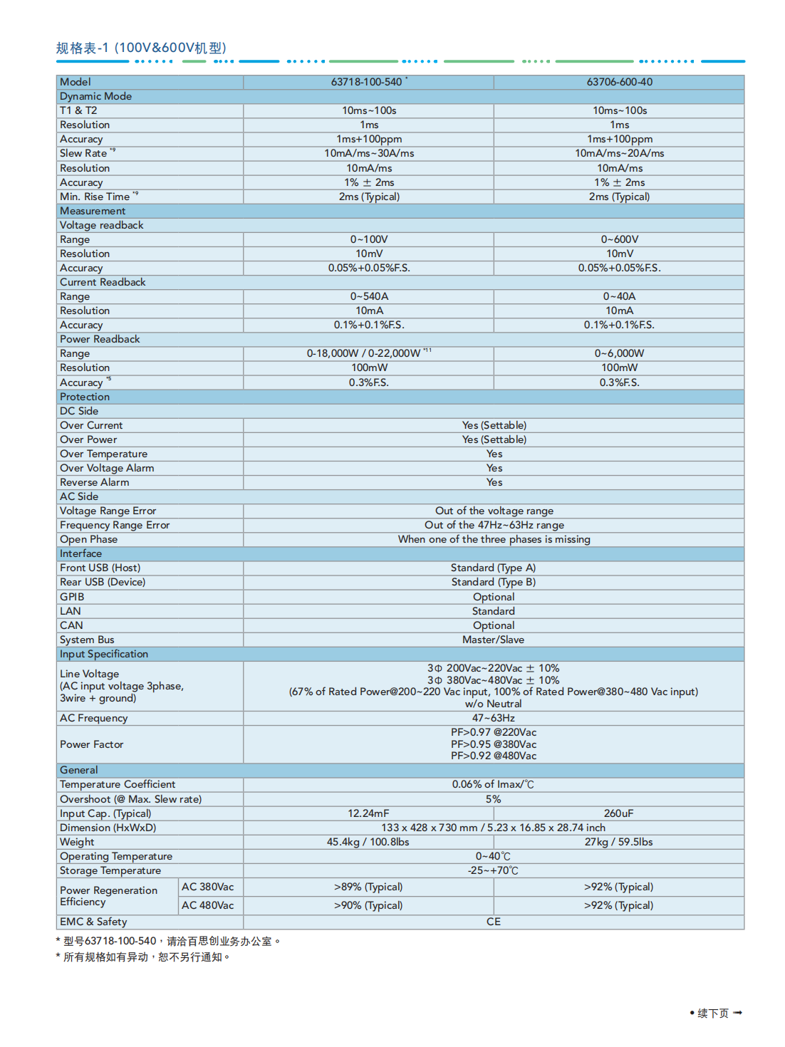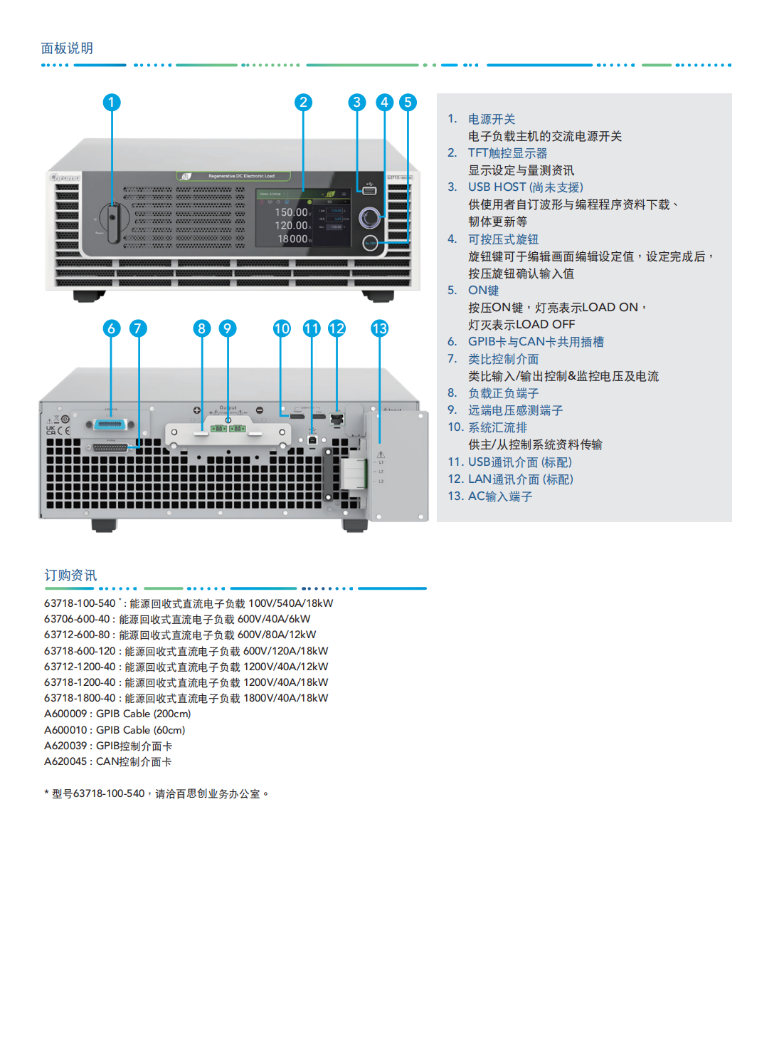 63700系列能源回收式直流电子负载,适用于电动车电池放电、燃料电池放电、大功率电源老化、直流充电桩、单向车载充电器可靠性、燃料电池发动机系统、储能系统、AC/DC与DC/DC电源供应器、功率电子元件及电力电子元件等产品信赖性测试使用。