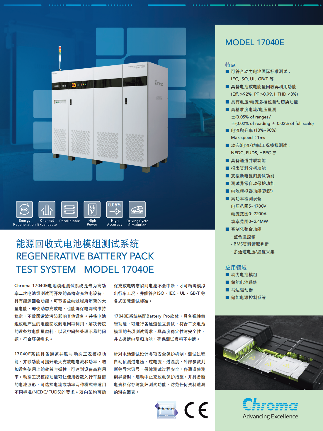 Chroma 17040E电池模组测试系统是专为高功率二次电池组测试而开发的高精密充放电设备,具有能源回收功能,可节省放电过程所消耗的大量电能,即使动态充放电,也能确保电网端维持稳定,不致因谐波污染影响其他设备。