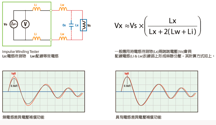 一般如变压器等感量较大的线圈进行测试时 ,配线等效感量相对较小, 但在低感量测试时(如0.2uH), 配线等效感量大小会影响待测物上之实际电压,尤其在自动化测试应用时, 降低配线影响是一重要设计考量。过高的配线阻抗会使低感量测试时电压分压在测线上, 导致待测物上的电压低于设定值而无 法有效检出不良品。且电感产品感量规格可达正负30%,因此于低感量测试应用时,会因待测物感量变化而造成实际端点上电压差异更加明显,导致 波形面积判定失效或测试电压未达要求之电压。Chroma 19301 具备电感差异电压补偿功能,改善上述问题及降低因感量差异造成于端点上实际电压的差异,进而降低误判的可能性。