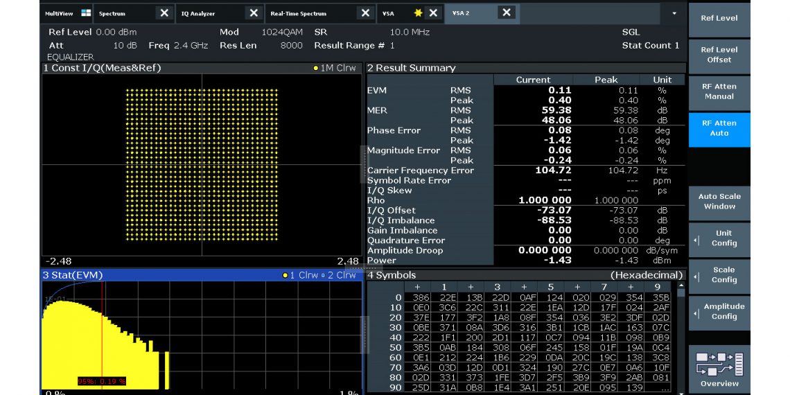 R&SFSW-K70矢量信号分析选件可帮助用户灵活分析精确到比特级的数字调制单载波。尽管分析工具数目繁多,但结构清晰的操作理念可以很好地简化测量。R&SFSW-K7OM可以分析采用两种不同调制方案的信号,例如DVB-S2X信号。R&SFSW-K7OP扩展选件可以测量PRBS数据(包括PRBS23)的原始误码率(BER)。